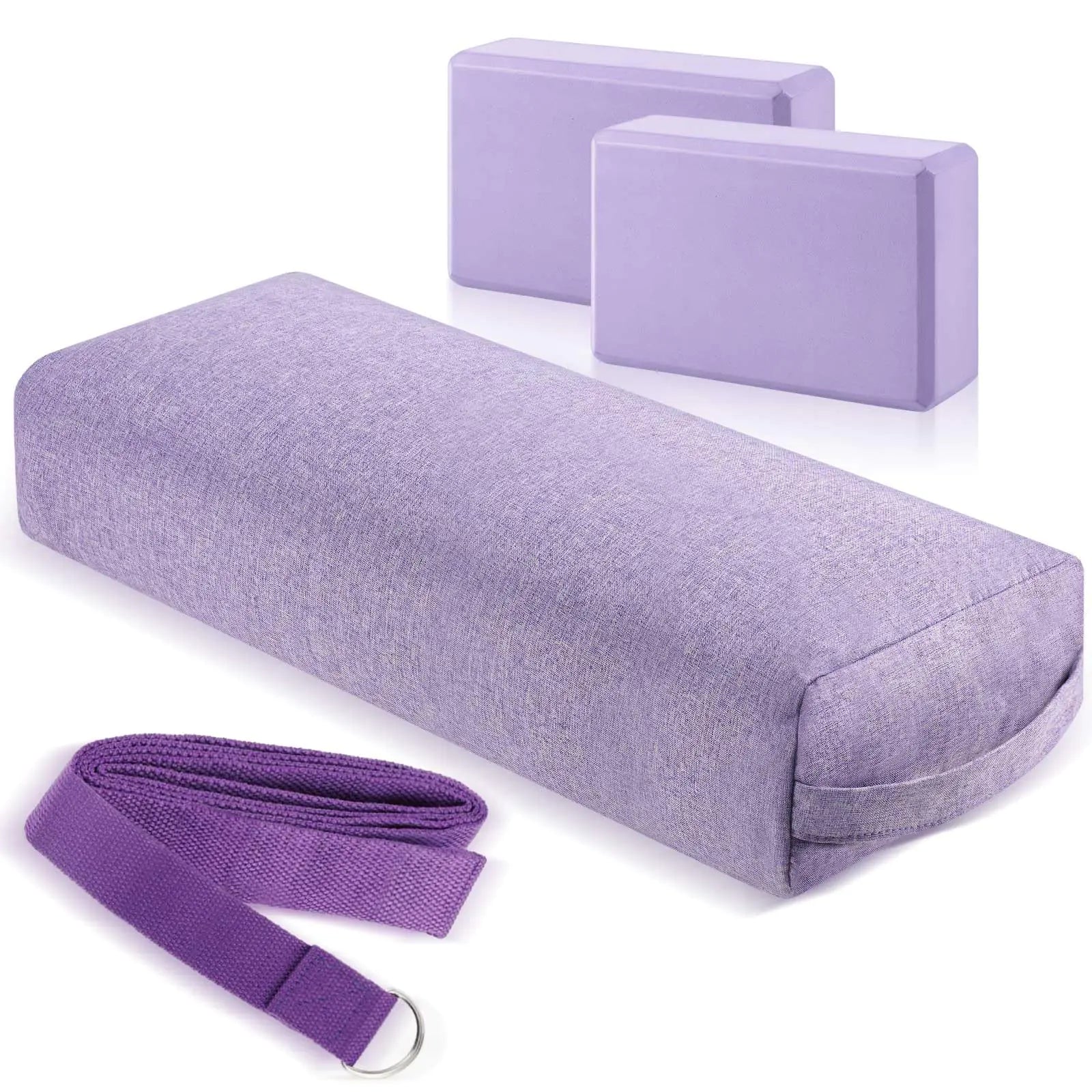 Features: Meditative. Match your yoga gear to the calming aura of your practice with this yoga straps and blocks smart and sophisticated purple color. This vibrant shade not only enhances the aesthetic appeal but also stimulates a calm and soothing environment conducive to mindfulness and relaxation. Quality assured. Enjoy a great blend of reliability and quality with this yoga bolster yoga strap and blocks set. Every item in the package has been made under strict quality control to ensure you get the ideal product for your yoga practice. Specifications: Material: yoga bolster: sponge. Color: purple. Package includes:1 x Sponge yoga bolster2 x Yoga bolsters1 x Yoga strap. Notes: Manual measurement please allow slight errors on size. The color may exist a slight difference due to different screen displays. Winding risk may exist please keep our product away from children. Please use our sports equipment scientifically under safe conditions and note that improper use may cause to the risk of injury. Pregnant women please consider carefully before use.